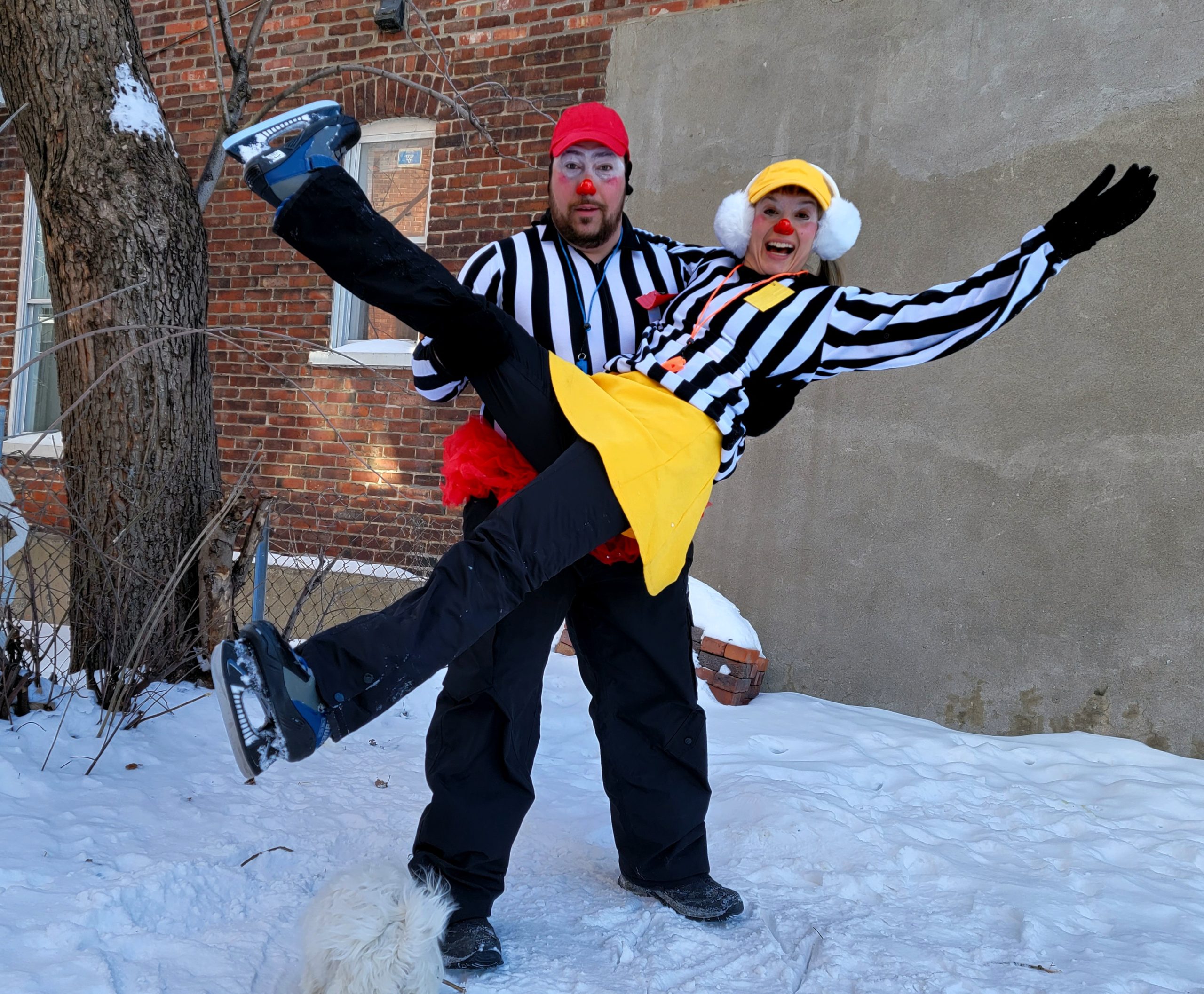 Les Arbitres Carton Jaune et Carton Rouge! Deux arbitres en patins (ou au sol) loufoques qui proposent des punitions absurdes et rigolotes. Plaisir et rire garantie avec ces 2 arbitres qui ont comme mission de faire respecter les règles. Une punition pour la tuque sur les yeux, carton jaune pour un un pompon hors dimension, sont des exemples parmi une panoplie de règlement que nos arbitres font respecter avec humour et aucune autorité.