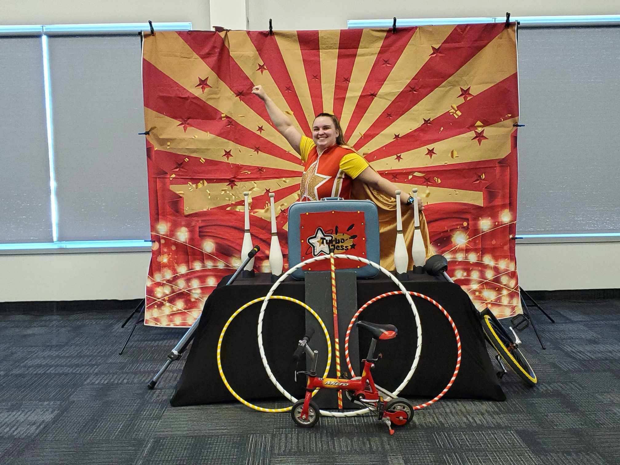 “Préparez-vous à plonger dans un univers où l’énergie et la virtuosité sont au rendez-vous avec Turbo Jess, la cascadeuse des arts du cirque. Maîtresse incontestée de la jonglerie, elle repousse les limites de son art à travers une série de défis audacieux et spectaculaires. Chaque mouvement est calculé avec une précision redoutable, chaque lancer d’objet semble défier les lois de la gravité, et son agilité saura captiver petits et grands.